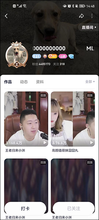 3、通过搜索进入到他的个人界面中心,别忘了点个免费的小关注,方便下次开播提醒,另外在主播的作品中就是回放视频啦。