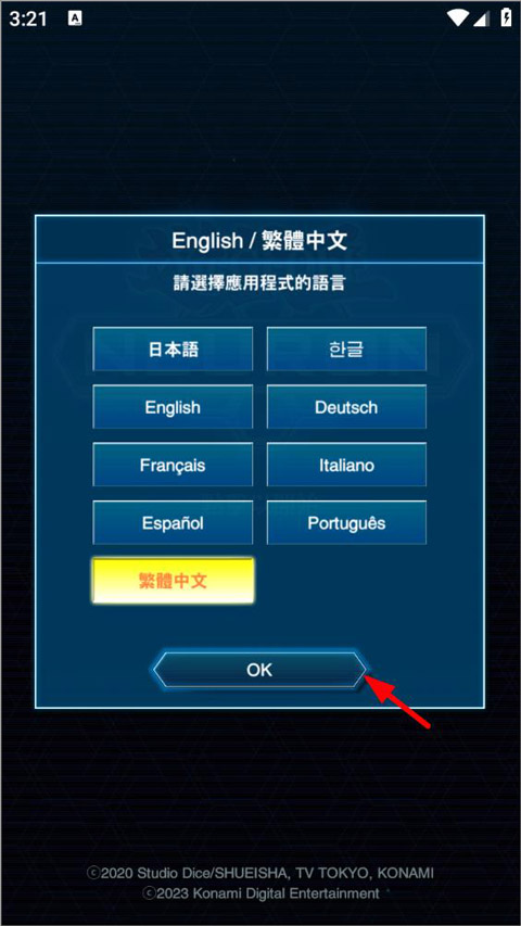 1、打开游戏王Neuron官方版,进入之后有语言选择,该软件服务区域未新增中国区域,所以用户可选择繁体中文,点击ok;