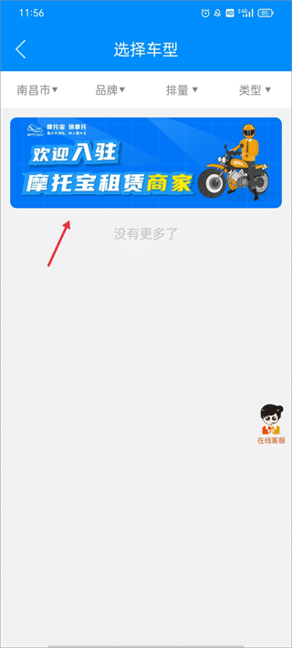 2、会看到有一个通告:欢迎入驻,摩托车宝租赁商家,点击进入里面。