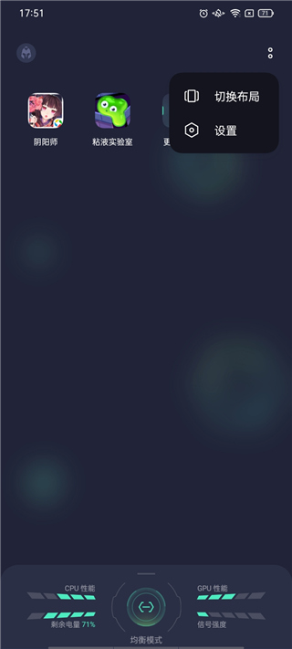 5、点击右上角我们还可以切换软件布局,以及设置,下方还为我们显示游戏的cpu性能、gpu性能、信号强度等详情,