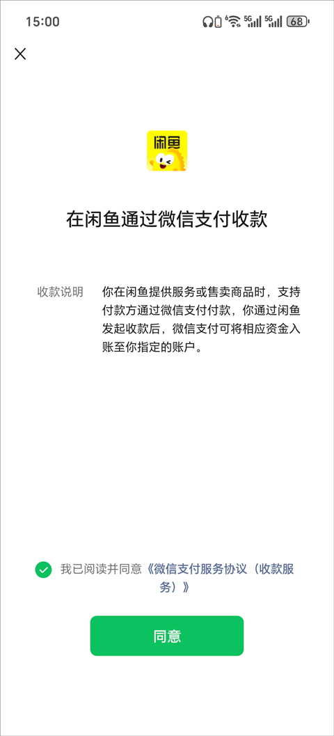 3、点击开通微信收款,然后跳转到微信,点击同意“在闲鱼通过微信支付收款”;