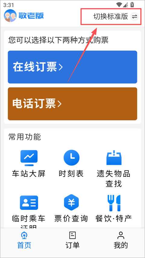 1、进入铁路12306敬老版app,点击首页顶部“切换标准版”按钮