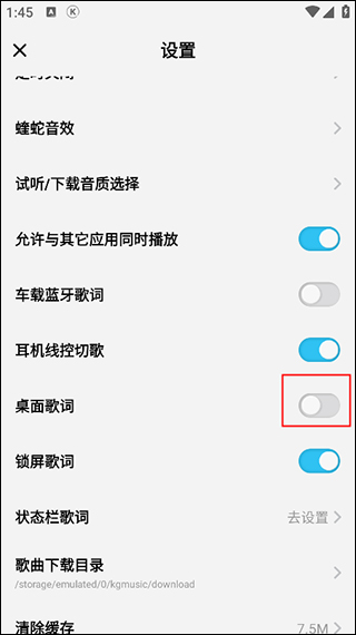 3、进入到设置页面,向下滑动屏幕找到“桌面歌词”选项,点击右侧的开关按钮;