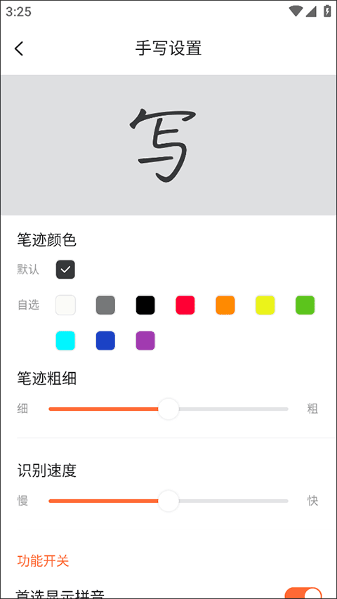 3、在手写设置当中,大家可以针对字体的颜色、笔迹的粗细、识别速度、功能开关进行统一设置。
