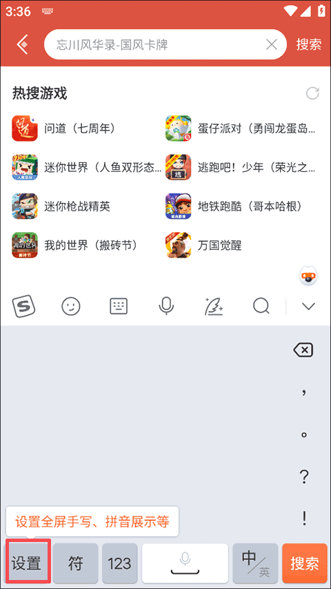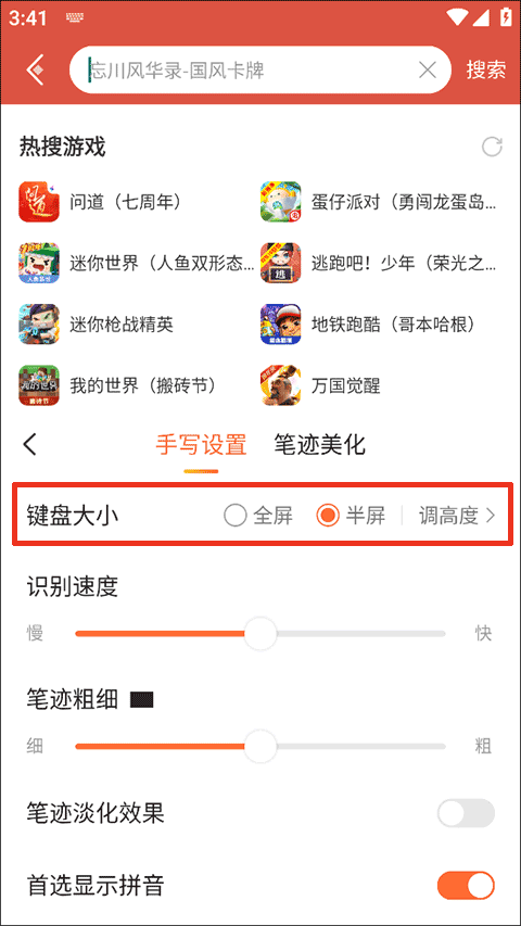 在用户手写的时候,搜狗手写输入法拥有极强的文字识别能力,只要是你书写完成的字,系统能够精准识别到,而且提供了众多候选词,方便用户找到自己写的那个字,还支持设置手写时的笔迹粗细和识别速度,以及调节手写键盘的大小,方便用户随心所欲的手写文字。