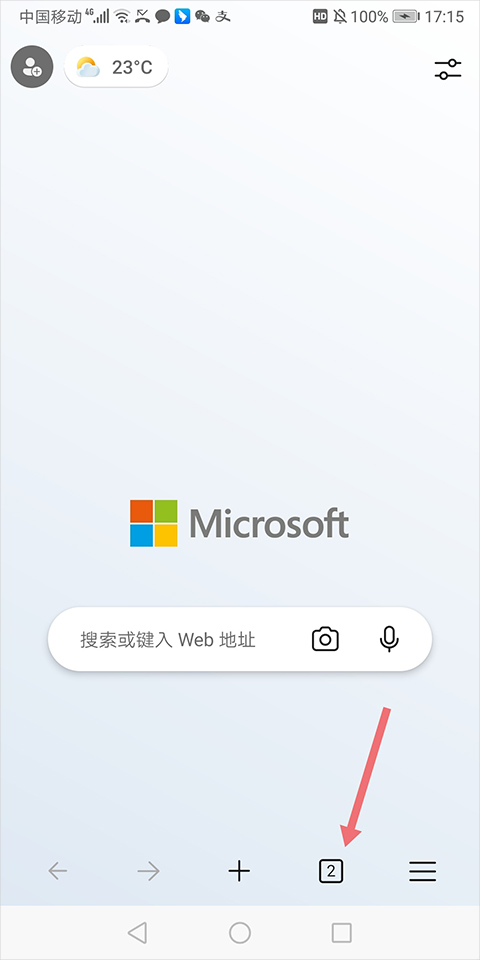 1、点击微软浏览器手机版主页面中右下角的功能菜单图标(下图红色箭头所指)