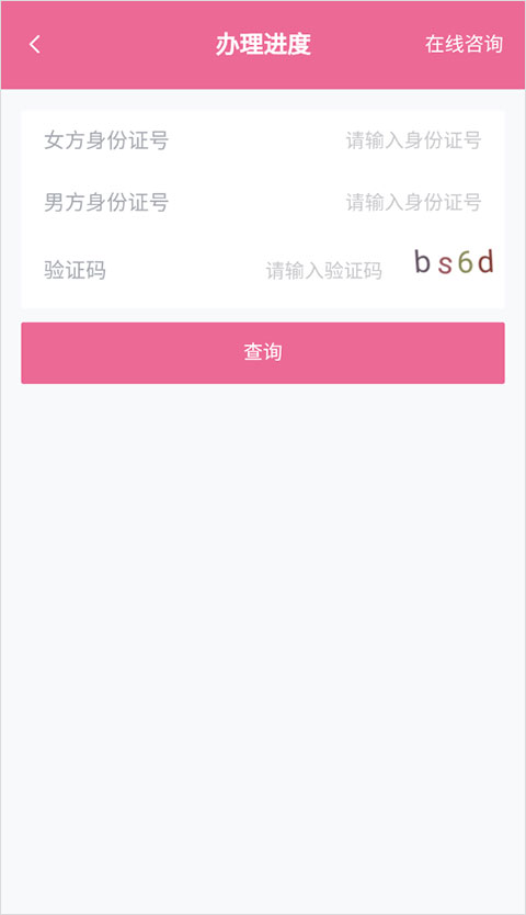 3、输入女方、男方身份证信息和验证码,点击【进度查询】进行检索。