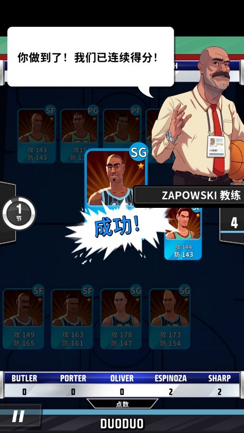 一般都是第二节和第三节会出现对手交锋,攻击交锋要选择我方的一名球员随机和对方球员进行攻击力与防守力的对比,攻击力更高则进攻成功,会获得连续得分;防守交锋则相反,用球员的防守值来对抗对手的攻击力,如果失败会被冰冻减少进球数量。