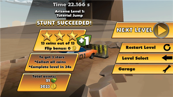 4、在关卡中我们可以不断的进行特技表演增加得分,过关后会依据得分判定星星的数量,三星通过可获得丰厚的奖励;