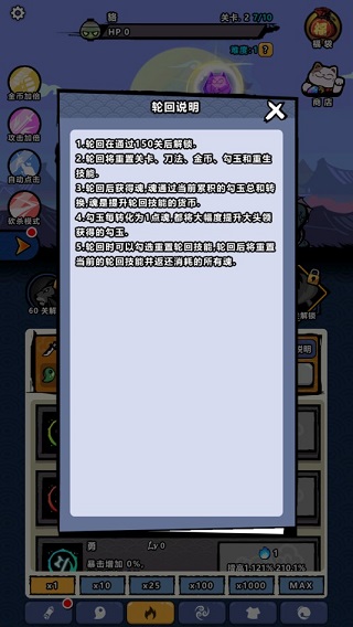 再说轮回这个东西,其实是好东西,但很坑,150关开启,但我不推荐立马轮回。轮回后保留宠物和怪物图鉴,勾玉清零!!!!!这个很重要,勾玉会都不见了。但是轮回后期你一定需要,他第一项就是增加勾玉获取速度,个人建议20个魂,100个魂,1000个魂这样去轮回,能保证你的勾玉获取速度。