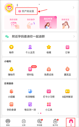 1、打开美柚后,在“我”界面。点击“预产期”