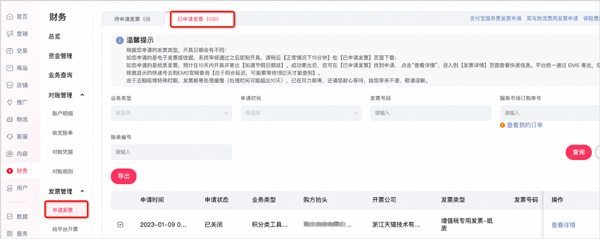 发票提交后的10天内会安排发票邮寄,后期您可以进入【千牛新版-财务-发票管理-申请发票】-【已申请发票】查询邮寄发票的运单号。