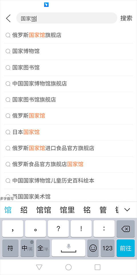 但是可以在天猫国际app首页中的顶部搜索框中输入“国家馆”,输入的同时用户可以看到其下拉选项中有部分国家馆的旗舰店之类的选项目,用户可以选择一个点击进去即可