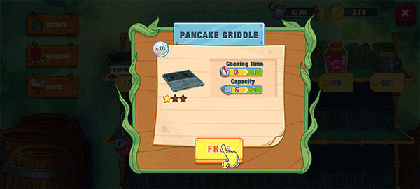 5、但是又有很多厨具和装饰升级时间很短,这个没有进行良好的设计,导致游戏中出现了很对卡关的情况;