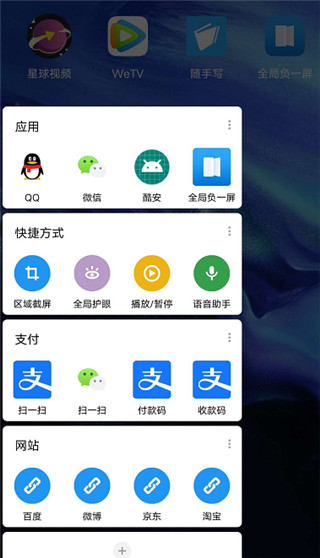 3、当你开启全局负一屏之后,手机桌面会出现一个区域很小的悬浮按钮,点击它即可打开全局负一屏的菜单信息栏,里面有应用、快捷方式、支付、网站4个栏目,支付目前只支持微信和支付宝的快捷支付方式,需要用到时,直接点击就能快速直达付款界面,而不用一步一步进入应用程序操作,非常方便。