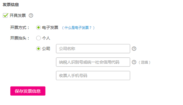 答:电子发票的抬头支持个人和公司名称,针对开具个人抬头的电子发票,系统默认发票抬头为“个人”;针对开具公司抬头的电子发票,发票抬头可自行填写公司名称。选择“个人”需填写收票人手机号码,选择“公司”需填写公司纳税人识别号或统一社会信用代码。