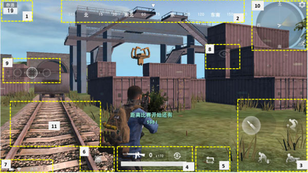 小地图显示区域,点击小地图可以查看放大版的小地图。 右上角为“设置”,点击可以呼出设置界面,进行操作模式的选择等。 右下角为“奔跑”,点击进入奔跑状态,但新的移动,射击,下蹲等操作会打断这个奔跑状态。 奔跑状态用于玩家需要长距离奔跑时,便有玩家操作。