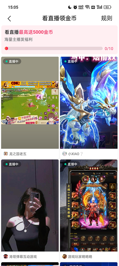 3、去直播板块查看直播可获得5000金币奖励;