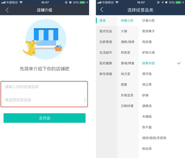 3、上传资料前需填写店铺名称及真实经营品类,美团外卖覆盖多种品类,确认后点击#去开店#。