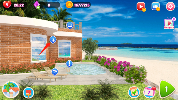 8、修建别墅需要金币,不过金币很容易获取只要你点击右下角的播放按钮1,即可进入消消乐游戏,玩游戏即可获得大量金币。