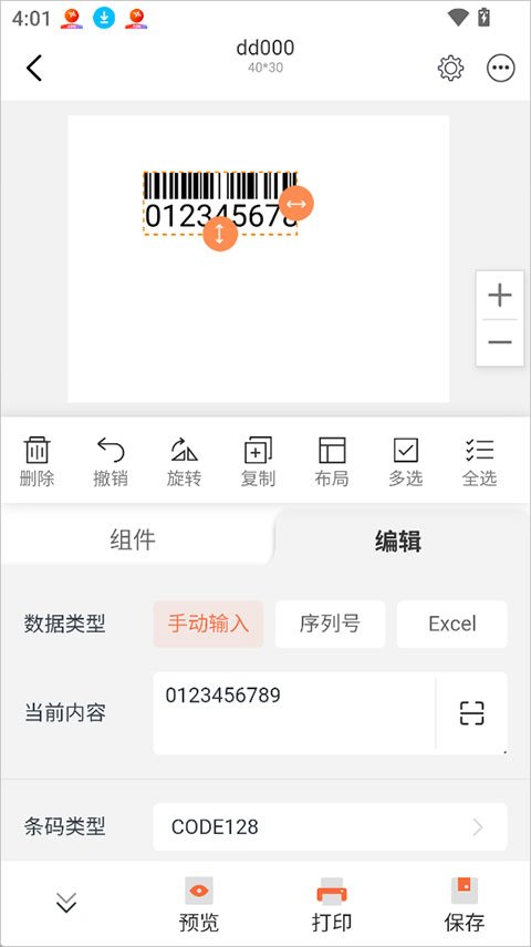 支持文字、条码/二维码、图片/图形、线条/矩形、免费表格编辑功能;可设置多字体、字号等,轻松设计任何形式的条码。