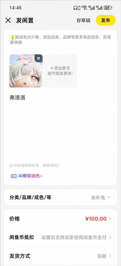 3、然后添加要卖物品的图片,并编辑内容介绍,以及设置价格、发货方式、所在位置;
